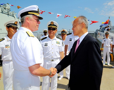 人民网北京8月16日电 据外交部网站消息,8月10日,驻美国大使崔天凯赴圣迭戈迎接到访的我海军171编队。当日下午,崔大使陪同海军副司令员田中中将,编队指挥员沈金龙少将出席了美国海军第三舰队举行的欢迎仪式。美国海军西南军区司令罗格少将等美军将领和当地华人华侨代表约200余人出席。