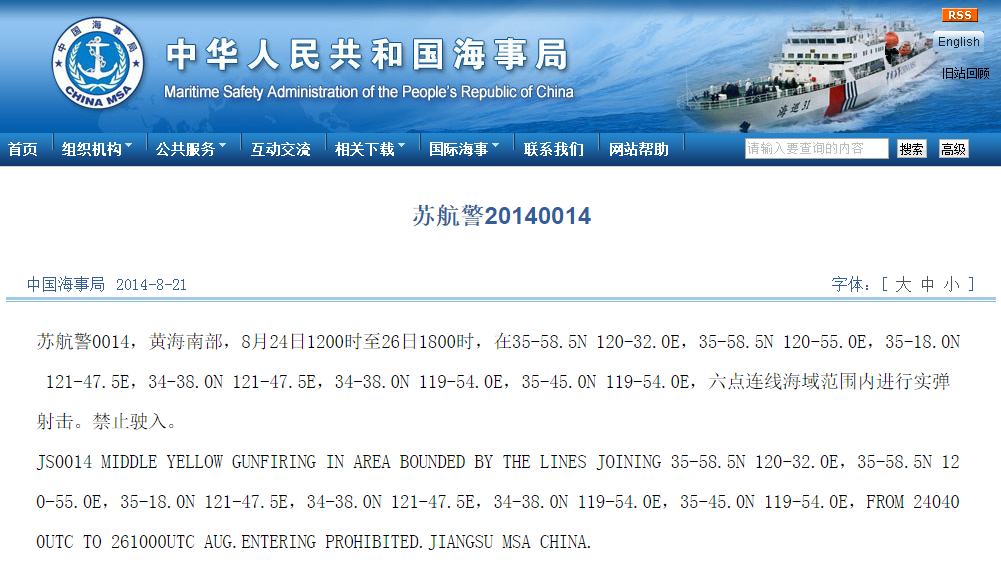 人民网北京8月22日电 中国海事局发布公告,8月24日12时至26日18时在黄海南部海域进行实弹射击,要求船只禁止驶入。