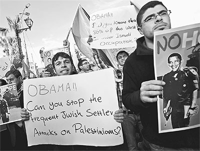 美国政府在中东问题上的外交政策引起当地民众不满。图为巴勒斯坦民众在约旦河西岸高举标语进行抗议。资料图片(人民视觉)