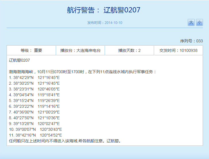 人民网北京10月10日电 据辽宁海事局网站消息,10月11日7时至17时,解放军将在渤海海峡相关水域执行军事任务,要求任何船只在上述时间内不得进入相关海域。