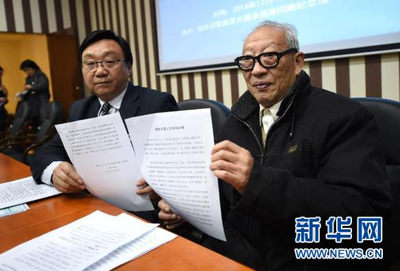 12月10日,南京大屠杀遇难同胞纪念馆馆长朱成山(右二)、南京大屠杀幸存者余昌祥(右一)展示公开信。 新华社记者 孙参 摄