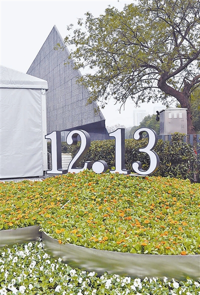 12月10日,南京大屠杀遇难同胞纪念馆前设置“12·13”花坛。近日,南京的侵华日军南京大屠杀遇难同胞纪念馆建筑及周边道路上布置了标语牌和花坛,以庄严肃穆的气氛迎接首个国家公祭日。新华社记者 孙 参摄