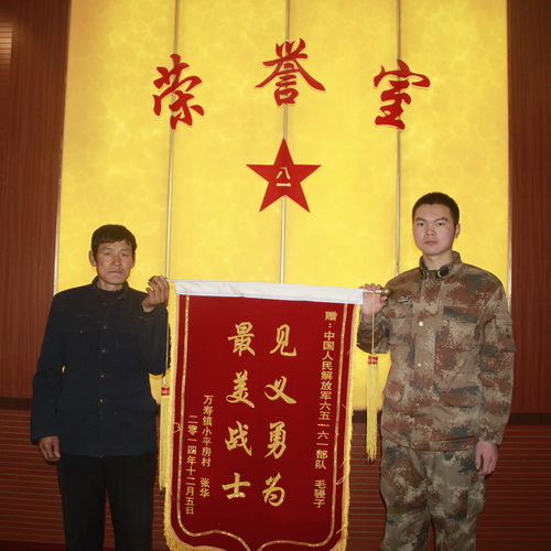 人民网沈阳12月12日电 “如果不是你及时仗义出手相救,后果简直不敢想象,谢谢你的救命之恩……”12月11日上午,辽宁省朝阳市建平县万寿镇68岁老人张华,手捧一面写有“见义勇为、最美战士”字样的锦旗,专程赶到沈阳军区某部,向该部管理处卫生所卫生员、上等兵毛骎子致谢。