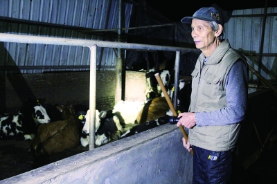 李连庆放下北京的舒适生活回到老家,带领乡亲们养牛创业。图为他13日夜10时,一手打手电,一手拿木棍巡牛棚。赵琦玉 曾强 摄