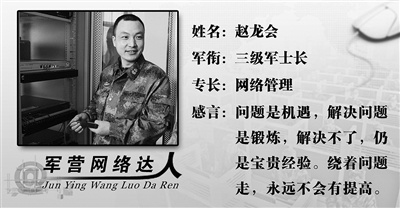 看着眼前这位面带笑容、性情随和的老兵,谁也不会想到,作为团网络管理员的他,曾多次向团领导说“不”。采访中,团领导却这样说:“赵班长这叫关键时刻能扛事儿,我们需要这样敢叫板的兵。”
