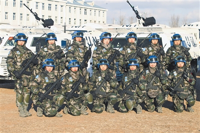 队列前排,13名女兵英姿飒爽。她们是中国走出国门执行维和作战任务的第一支女子步兵班。巾帼不让须眉,女兵们与男队员一样摸爬滚打,训练成绩相当优秀,在自动步枪射击中都打出过满环。“女兵人少,但要顶‘半边天’。”女兵班班长王珮说,她们除了担负与男队员一样的维和任务外,还要负责当地妇女、儿童的保护和沟通等工作。