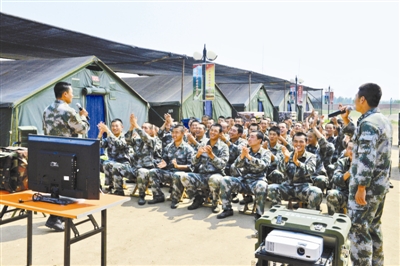 训练间隙,四连官兵进行战地卡拉OK大赛。唐照胜摄