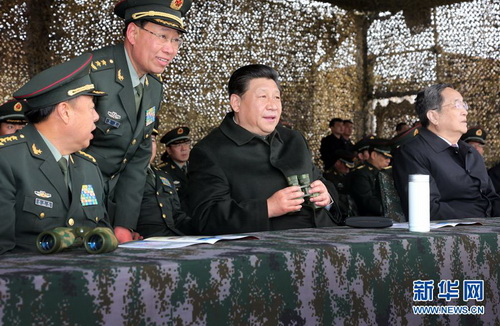 2014年4月29日,习近平在新疆军区综合训练场实地观摩部队实战化训练课目演示。新华社记者 李刚 摄