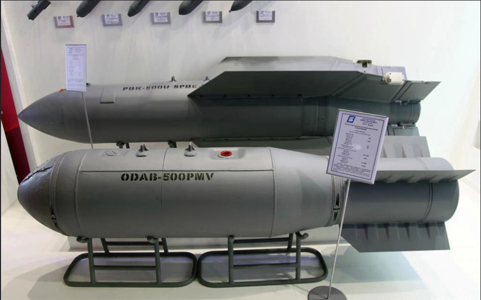 ODAB-500PM燃料空气炸弹解剖图,尾部有减速伞保证炸弹落地时速度较慢。为追求更大的爆炸效果并缩小炸弹体积,各国开始寻找爆炸猛度和燃烧热更高的燃料。