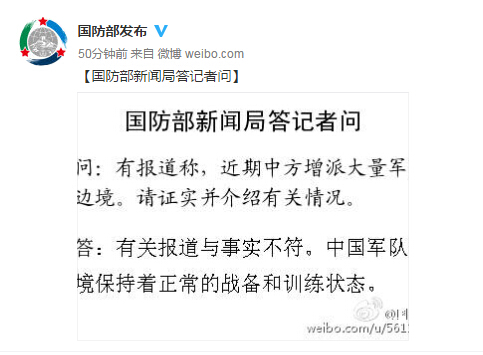 人民网北京4月22日电 据国防部新闻局官方微博消息,国防部新闻局今日回应“近期中方增派大量军队至中朝边境”报道时表示,有关报道与事实不符。中国军队在中朝边境保持着正常的战备和训练状态。