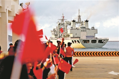 “编队准备完毕,请示起航!”编队指挥员向南部战区海军领导报告后,军乐队奏响《欢送进行曲》,编队各舰依次解缆,缓缓驶离码头。甲板上,任务官兵整齐列队,向祖国和人民庄严敬礼、挥手告别。
