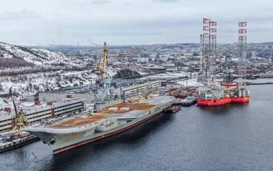 资料图片:在摩尔曼斯克造船厂中维修的俄航母。