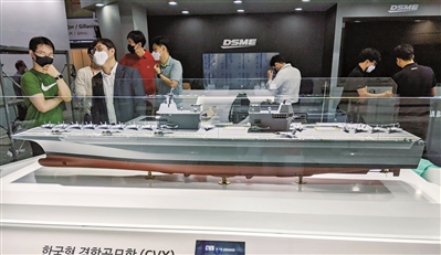 近日,2021年度国际海事防务展在韩国釜山举行。展会上,最引人注目的是占据展馆面积达1/3的韩国新一代航母项目,其中现代重工和大宇造船两大集团分别展出各自的航母方案,吸引了外界的目光。