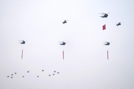 4架运输直升机,悬挂着4面巨幅标语紧随其后——“伟大的中国共产党万岁”“伟大的中国人民万岁”“伟大的中华人民共和国万岁”“全国各族人民大团结万岁”。