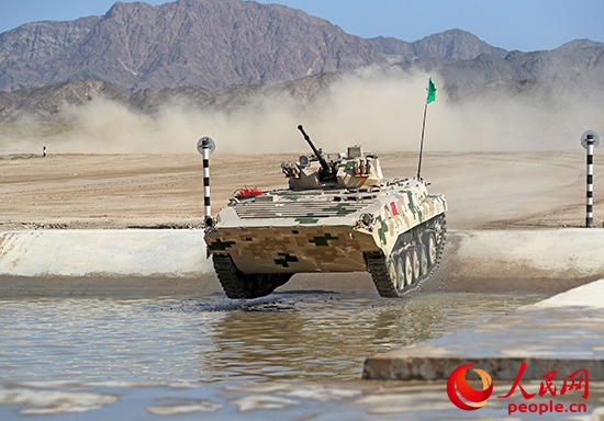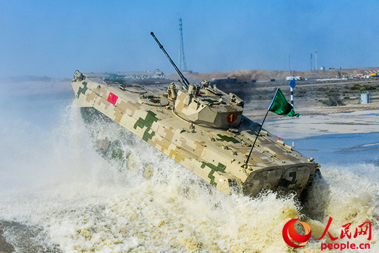 中国参赛队员驾驶步战车驶出涉水场。王俊摄
