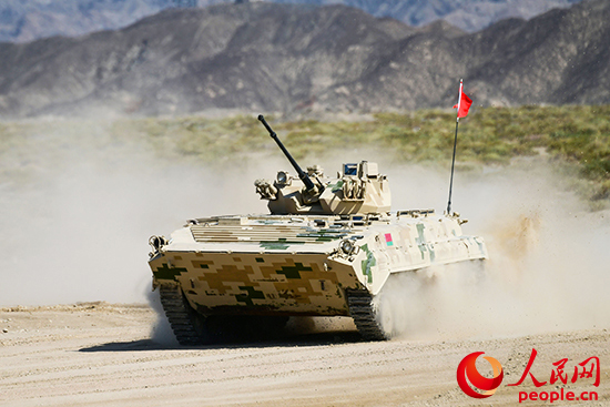 白俄罗斯参赛队员驾驶步战车通过比赛路段。王俊摄