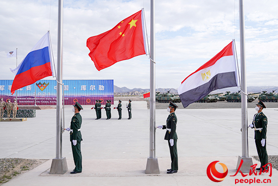9月4日,“国际军事比赛-2021”中国库尔勒赛区正式闭幕,现场举行升旗仪式。张永进摄
