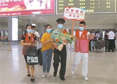 笔者看到,各县(市、区)火车站、汽车站等出口处悬挂着欢迎退役军人返乡横幅,身着红马甲的退役军人事务局工作人员、“新长征”退役军人志愿者、拥军义工,走进车站做好迎接退伍返乡老兵的相关工作。据了解,他们联合开展“发一份疫情防控须知、递一份老兵返乡报到指南、披一次欢迎返乡绶带、戴一朵大红花、说一句暖心的话、送一杯热茶、拍一张返乡照片、专车接送一次回家、一站式服务、第一时间告知‘优军码’使用方法”为主要内容的“十个一”活动。此外,还充分利用当地电视台、“两微一抖”、车站和市政广场大屏等媒介,滚动播出迎接退役军人返乡活动的喜庆场面,在全社会营造“当兵光荣”的浓厚氛围,激发老兵退伍不褪色、返乡建新功的壮志豪情。