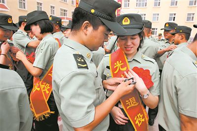 9月5日,新疆军区某火力团举行退役军人向军旗告别仪式,战友为退伍老兵摘下肩章、领花。杨熙摄