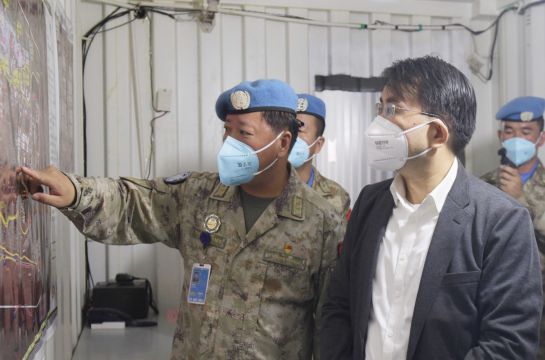 华宁专程走上联合国营地2号、9号哨位现地慰问执勤哨兵,与他们亲切交流,并代表中国驻南苏丹大使馆向他们及远在万里之外的亲人致以节日的问候。华宁赞扬维和官兵不畏艰苦、不怕牺牲,用实际行动捍卫着南苏丹的和平,展示了中国军人的良好风貌。(何鹏刚、曹壮)