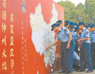 10月1日,南部战区空军某场站组织开展节日文化活动。图为官兵将祝福寄语献给祖国。张越摄