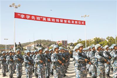 “赓续光荣传统,争做‘李学先班’传人……”军委政治工作部为获得重大荣誉的英模班排制作的荣誉柜下发部队后,海军陆战队某旅第一时间举行荣誉柜发放仪式,为前身为“李学先班”的机步四连二班发放荣誉柜。