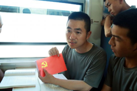 某连指导员在机动途中向官兵讲述党旗的来历和意义
