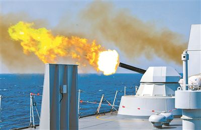 “预备——放!”随着指挥员一声令下,一枚枚炮弹划破海空。数秒钟后,目标区域火光冲天,硝烟弥漫。