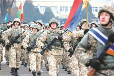 1月13日,在哈萨克斯坦阿拉木图,集安组织维和部队在送行仪式上接受检阅。新华社发