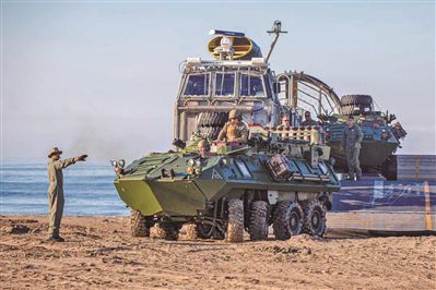 美国海军陆战队员卸载轻型装甲车。