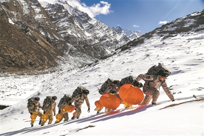 上图:该连物资运送小分队徒步往岗拉哨所送年货。张照杰摄