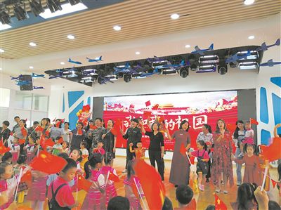 图为王博(中)在蓝天宇锋幼儿园与小朋友一起表演节目。孙悦摄