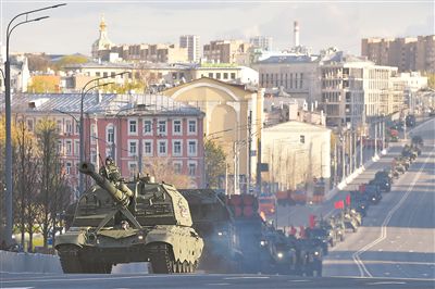 5月4日,在俄罗斯首都莫斯科,参加阅兵活动彩排的军用车辆从市区驶过。俄罗斯国防部长绍伊古在4日召开的电话会议上说,纪念卫国战争胜利77周年的阅兵活动将于5月9日在俄罗斯28个城市举行,约有6.5万人、2400余种军事装备和460多架飞机参与阅兵。