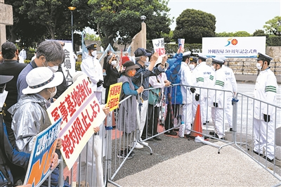 5月15日,在日本冲绳,人们在冲绳回归日本本土50周年纪念仪式现场外抗议。15日是冲绳回归日本本土50周年纪念日,日本政府和冲绳县政府当天在东京和冲绳两地举办纪念仪式。大批冲绳民众在会场外强烈抗议,要求削减冲绳美军基地规模甚至将美军基地全部撤出。1945年4月,美军占领冲绳。1972年5月15日,冲绳的施政权被正式交还给日本政府。新华社发