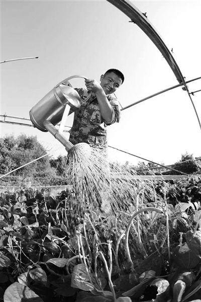 图④:徐强给菜地浇水。曾梓煌摄