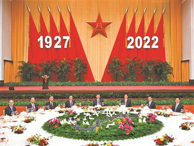 人民大会堂宴会厅灯火璀璨,洋溢着热烈喜庆的节日气氛。主席台上方悬挂着庄严的“八一”军徽,“1927-2022”的大字年号在红旗映衬下格外醒目,昭示着中国人民解放军走过95年的光辉历程。