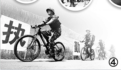 霍尔果斯边防连官兵骑车在边境线巡逻。 新华社记者 琚振华摄