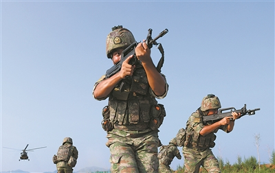 完成首轮攻击,战机迅速跃升,大机动脱离直插云霄。数分钟后,战机再次建立攻击航线。空中射击完毕,地面作战队员立即对目标区域“敌”残余力量实施补充打击。