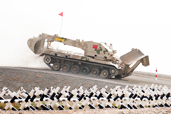 随着裁判长一声令下,第一组出场的中国车组和委内瑞拉车组迅速驶出,抵达弹坑路段后使用推土装置展开紧张作业,中国参赛队的清障车组率先通过开辟出的通路,精准完成木质堆垛的夹抓和放置,全速推开火障……