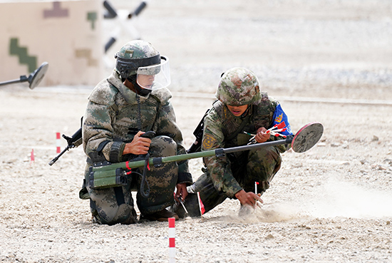 在随后进行的比赛中,参赛队员们从直升机平台从天而降,爆破突入建筑物,扫雷精准识别,动作迅猛敏捷;架桥组通力配合,协力跨越41米长、3.5米深的壕沟,引导车组跨桥行进,赢得了在场观众们的热烈欢呼。