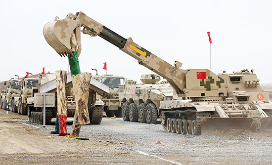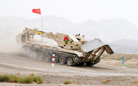 “安全路线”项目接力赛,旨在全面检验工兵分队战时机动和保障能力,按照突击工兵班、架桥组、开路机组、清障车组编队连贯实施,不设间隔和休息时间。各参赛队要在2.5公里的环形封闭赛道上完成工程作业、实弹射击、快速机动等内容。其中,架桥组在架设桥梁的同时,突击工兵班模拟对架桥作业实施掩护展开实弹射击。开路机组、清障车组随后通过桥梁依次克服直行限制路、桩间转弯限制路、土岭、车辙桥等障碍,在完成相应的工程作业后,所有队员驾乘车辆集体冲过终点。