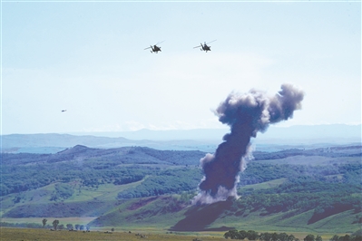 连续多日的暴雨结束后,谢尔盖耶夫斯基训练场天高云淡。中方空中战术群数架歼-10B战机与俄方侦察机、轰炸机联合行动,高空对“敌”重要目标展开精确打击;中方陆上战术群数架直-10、直-19等直升机低空对“敌”实施密集火力打击;中方陆上战术群99型坦克、04A步战车等陆上力量在山丘间卷起滚滚尘土,迅速突破“敌”阵地前沿;中方海上战术群在日本海相关海域与俄方舰船联合展开编队航行、摧毁浮雷等科目演练。