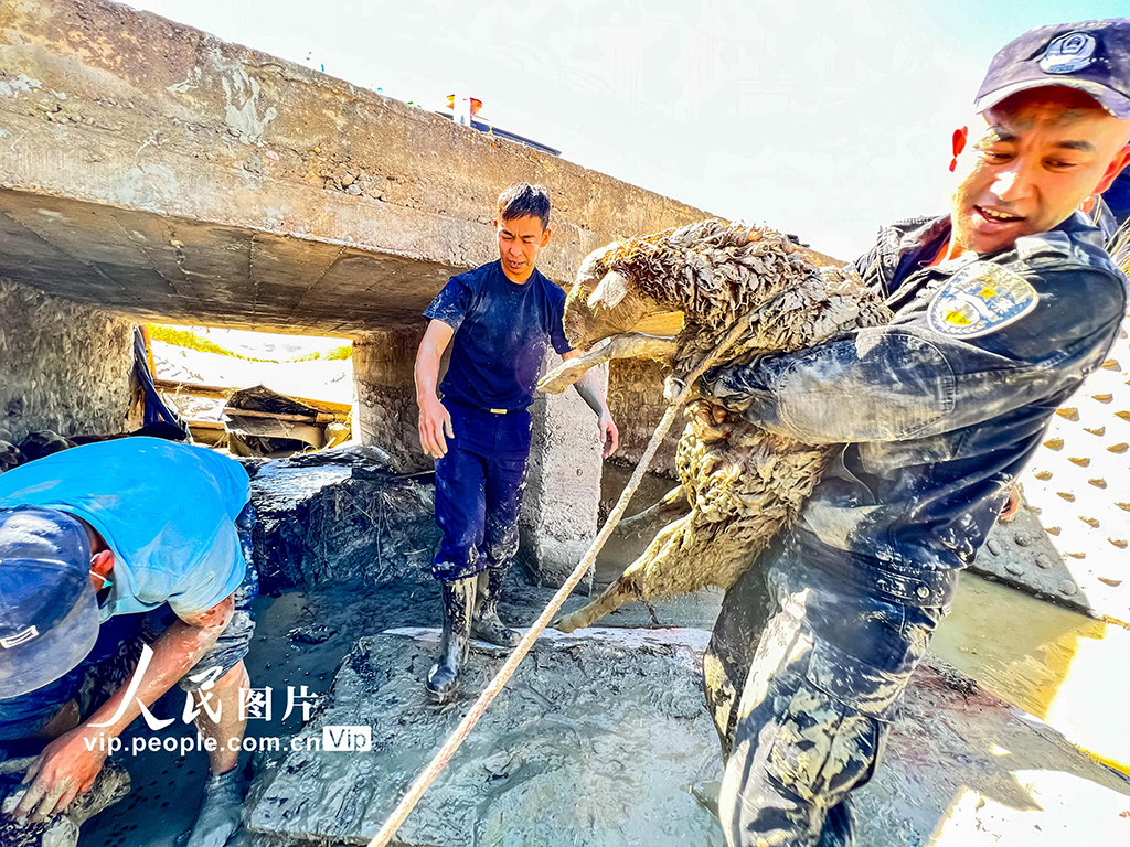 新疆伊犁:羊群深陷泥潭 民警紧急施救