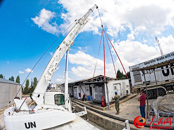 中国维和官兵帮助马来西亚营吊装发电机。李竹林摄