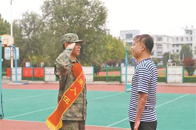 上图:王浩旭(左)向父亲王永波敬礼道别。代腾飞摄