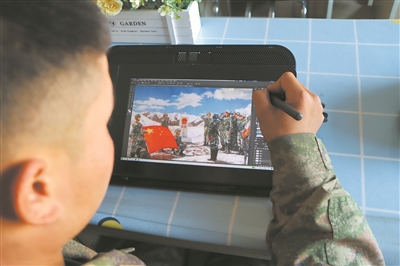 战士利用电子设备创作爱党爱国题材绘画作品。