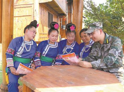 10月28日,贵州省天柱县人武部组织民兵宣讲小分队深入高酿镇地佳村,用侗汉双语向村民宣讲党的二十大精神。