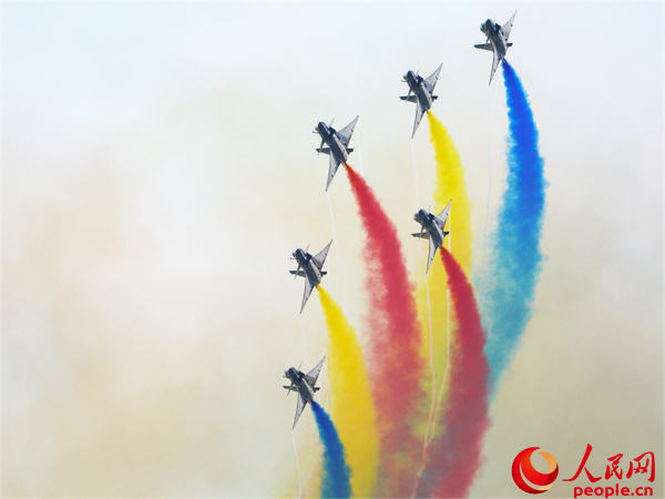 中国空军八一飞行表演队在第十四届中国航展上进行飞行表演。唐宋摄