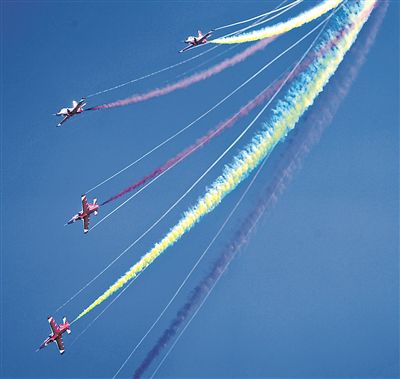 飞行表演不仅是一项绚丽多彩的飞行活动,威武雄壮的空中仪仗,更是一个展现大国气度、军队风采的亮丽窗口。彩色烟带勾勒壮美航迹!7架飞机将彩色烟带洒向蓝天,空军两支飞行表演队圆满完成各种动作,聚焦战机凯旋的目光愈加热切……(王树 李建文)