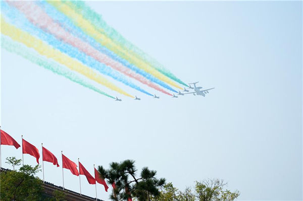 2019年10月1日上午,庆祝中华人民共和国成立70周年大会在北京天安门广场隆重举行。这是领队机梯队拉出绚丽的彩烟。 新华社记者 李刚 摄